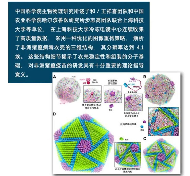 【编者按】2020年2月27日,科学技术部高技术研究发展中心发布了2019年度中国科学十大进展,由我所参与完成的重大科学进展“揭示非洲猪瘟病毒结构及其组装机制”入选。非洲猪瘟病毒(ASFV)是一个巨大而复杂的DNA病毒,能够引发家猪、野猪患急性、热性、高度传染性疾病,发病率和死亡率可高达100%,对生猪养殖产业链造成巨大经济损失,目前尚未有可用的疫苗。中国科学院生物物理研究所饶子和/王祥喜团队和中国农业科学院哈尔滨兽医研究所步志高团队联合上海科技大学等单位,在上海科技大学冷冻电镜中心连续收集了高质量数据,采用一种优化的图像重构策略,解析了非洲猪瘟病毒衣壳的三维结构,其分辨率达到4.1埃。该衣壳颗粒体型巨大且结构复杂,结构细节揭示了衣壳稳定性和组装的分子基础,对非洲猪瘟疫苗的研发具有十分重要的理论指导意义。
