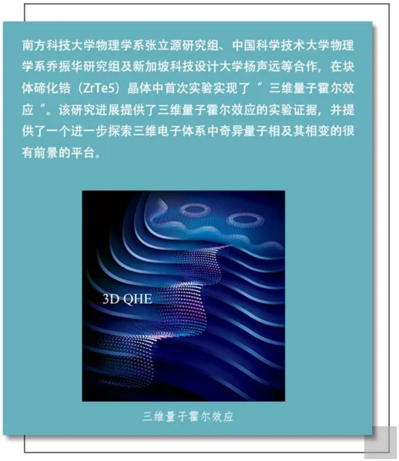 张立源和乔振华等研究组首次在块体碲化锆材料上观测到三维量子霍尔效应,并指出该量子化现象可能由磁场下相互作用产生的电荷密度波诱导,补全了量子霍尔效应家族的一个重要拼图。