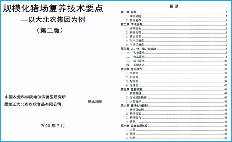 去年9月,由中国农科院哈尔滨兽医研究所仇华吉研究员牵头完成的《规模化猪场复养技术要点》已在黑龙江、天津、山东、江苏、湖北等地区推广,服务的企业包括大北农、猪世纪、上海农场等。