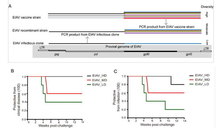 近日,中国农业科学院哈尔滨兽医研究所兽医生物技术国家重点实验室王晓钧团队,首次证实了马传染性贫血病毒(EIAV)病毒囊膜蛋白(env)的多样性组成是马传贫病毒弱毒疫苗能够诱导免疫保护的关键因素。相关研究成果以“Env diversity-dependent protection of the attenuated equine infectious anemia virus vaccine ”为题于2020年6月11日发表在国际病原学专业学术期刊《新发微生物与感染(Emerging Microbes & Infections)》。