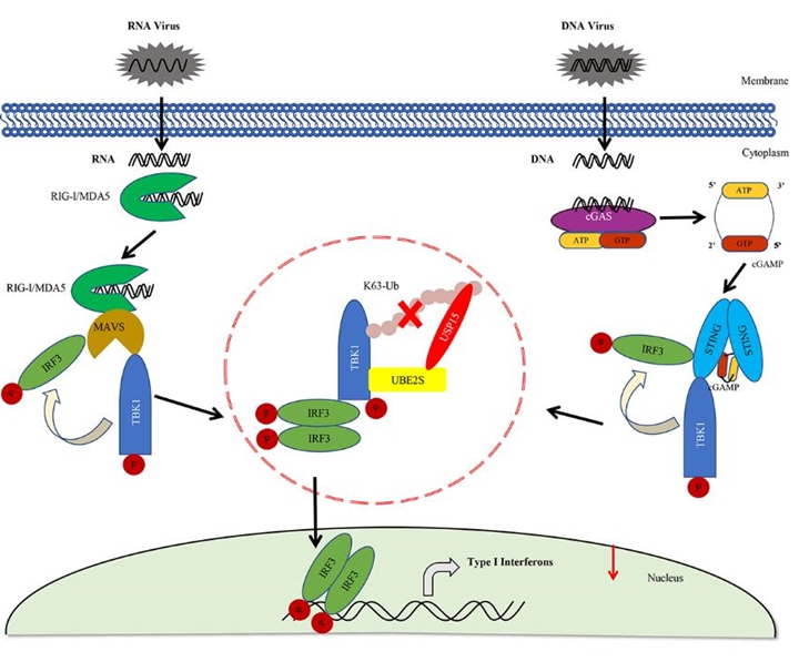 先天免疫系统是宿主抵御病原感染的第一道防线。病毒感染引发宿主细胞模式识别受体(PRRs)识别病原相关分子模式(PAMPs)并激发一系列的级联反应,最终促进了干扰素和促炎性细胞因子的表达,产生抗病毒效应。蛋白质泛素化是蛋白质翻译后的重要修饰形式,E1泛素激活酶、E2泛素结合酶和E3泛素连接酶是泛素化系统的关键酶。大量研究表明泛素化修饰在天然免疫信号通路中起着至关重要的作用。E3泛素连接酶和去泛素化酶协同作用精确地调节可逆的泛素化过程,影响着宿主的天然免疫反应。