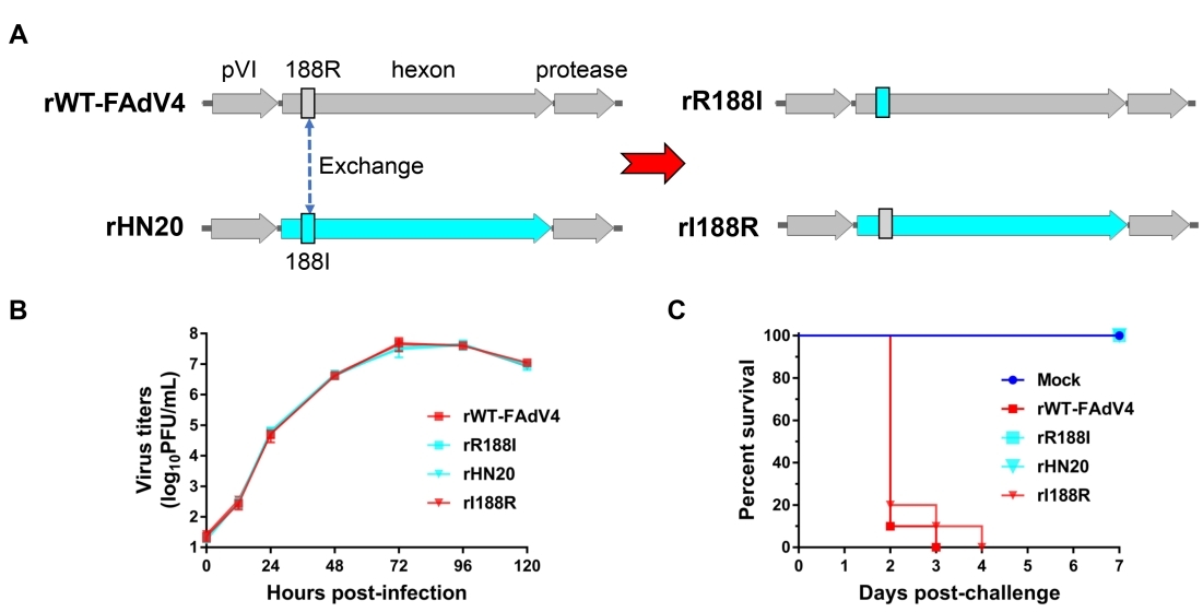 该研究中,研究者首先利用Fosmid系统建立了FAdV-4的反向遗传操作技术,利用该技术对病毒基因组骨架进行基因替换和点突变。基因替换结果证实,Hexon基因是决定新型FAdV-4高致病性的关键基因;进一步利用点突变对强弱毒Hexon基因的13个氨基酸差异位点进行突变,证实Hexon第188位氨基酸对病毒毒力起到决定性作用(图1)。将高致病性的野生型FAdV-4 Hexon第188位氨基酸由R突变为I的重组毒rR188I完全丧失对SPF鸡的致病性,而将无致病性的rHN20 Hexon第188位氨基酸由I突变为R,则重组毒rI188R恢复对SPF鸡100%的致死率。