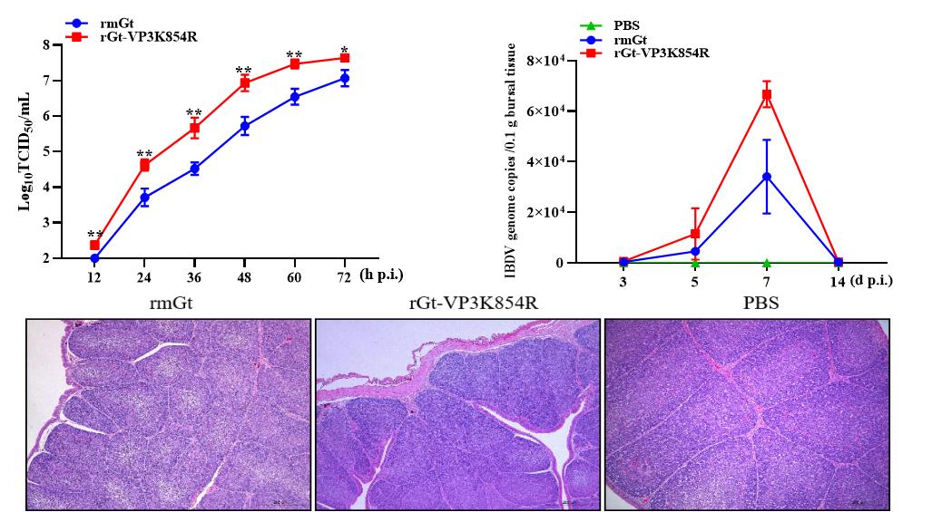 本研究通过RNA-seq筛选到TRIM25可作为潜在的抗IBDV的宿主因子。深入研究发现,TRIM25作为宿主限制性因子通过直接泛素化病毒结构蛋白VP3使其降解进而抑制IBDV的复制。重要的是,作者进一步证明了VP3的854位赖氨酸为TRIM25介导的关键泛素化位点,该位点突变后可降低VP3被TRIM25泛素化的程度,破坏宿主抗病毒的作用,使IBDV在体内和体外的复制能力提高了2-5倍,且不影响病毒的致病性。这些结果不仅阐明了TRIM25抑制IBDV复制的分子机制,也为开发高效价IBD活疫苗提供了重要的理论依据。