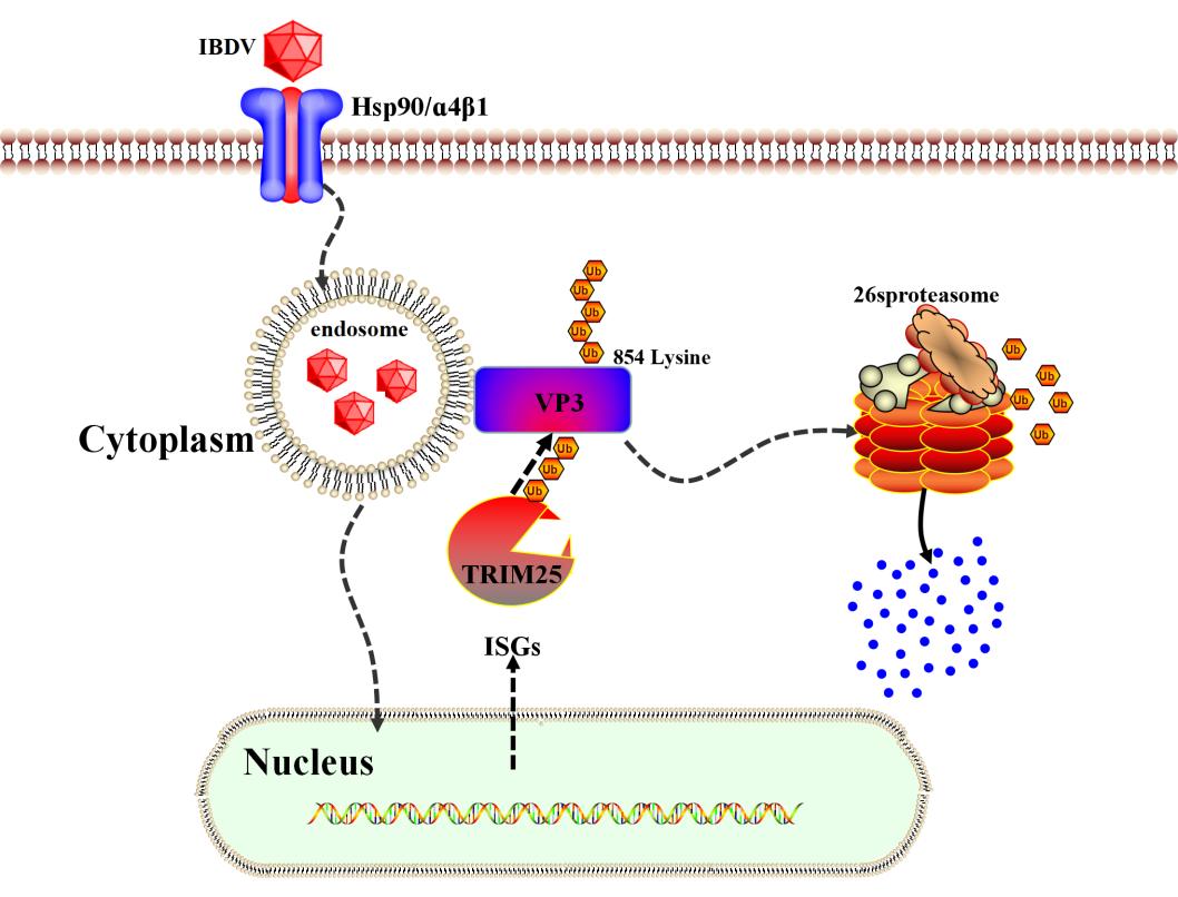 近日,中国农业科学院哈尔滨兽医研究所兽医生物技术国家重点实验室禽免疫抑制病创新团队在TRIM家族蛋白调控传染性法氏囊病病毒复制研究方面取得重要进展,相关研究成果以“TRIM25 inhibits infectious bursal disease virus replication by targeting VP3 protein for ubiquitination and degradation”为题,于2021年9月13日在线发表于《公共科学图书馆-病原学(PLoS Pathogens)》杂志上。该研究阐明了TRIM25抑制传染性法氏囊病病毒的分子机制。