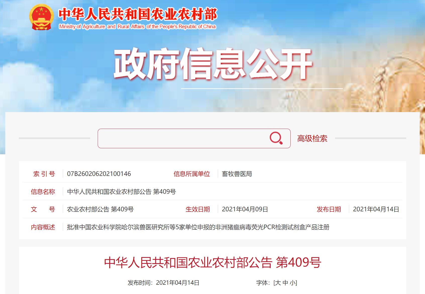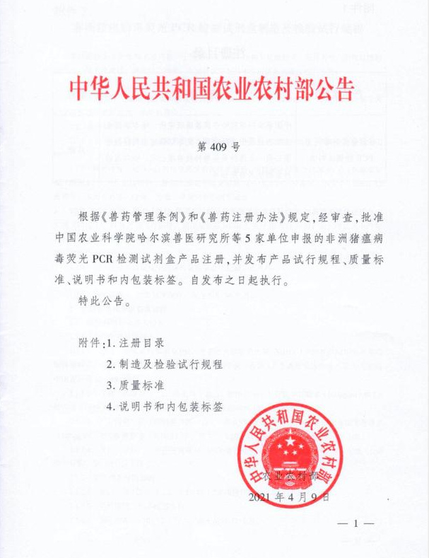 据农业农村部发布的第409号公告获悉,由中国农业科学院哈尔滨兽医研究所猪烈性传染病创新团队联合哈尔滨国生生物科技股份有限公司等4家单位申报的非洲猪瘟病毒荧光PCR检测试剂盒,获得国家兽药产品注册批准。该试剂盒也是哈尔滨兽医研究所获批的首个非洲猪瘟诊断制品。