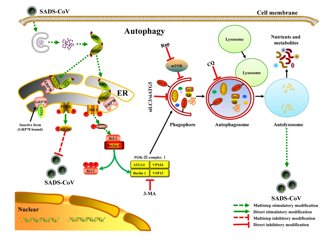 猪急性腹泻综合征冠状病毒(SADS-CoV)是2017年新发现的蝙蝠源冠状病毒,可导致仔猪严重腹泻、脱水和死亡。自噬是机体对抗病原体的天然防御机制,但最近越来越多的证据表明包括SADS-CoV在内的许多病毒已进化出多种策略抵抗、逃逸、甚至利用细胞自噬促进自身增殖。