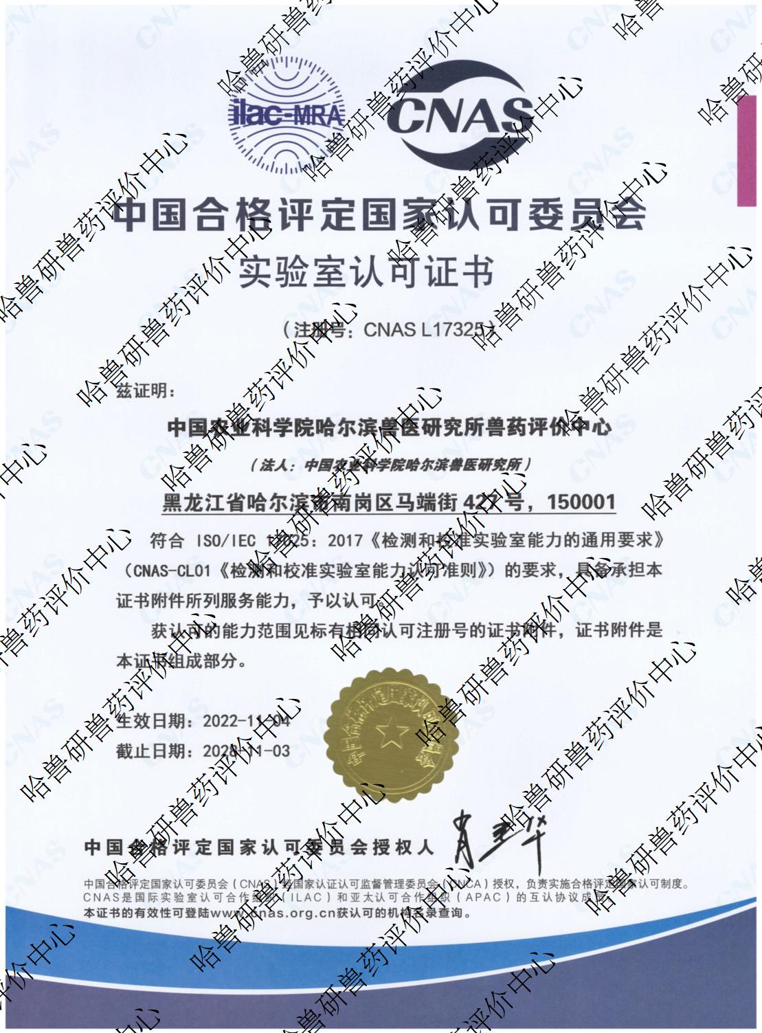 11月4日,中国农业科学院哈尔滨兽医研究所兽药评价中心(简称中心)获得中国合格评定国家认可委员会(CNAS)颁发的实验室认可证书。