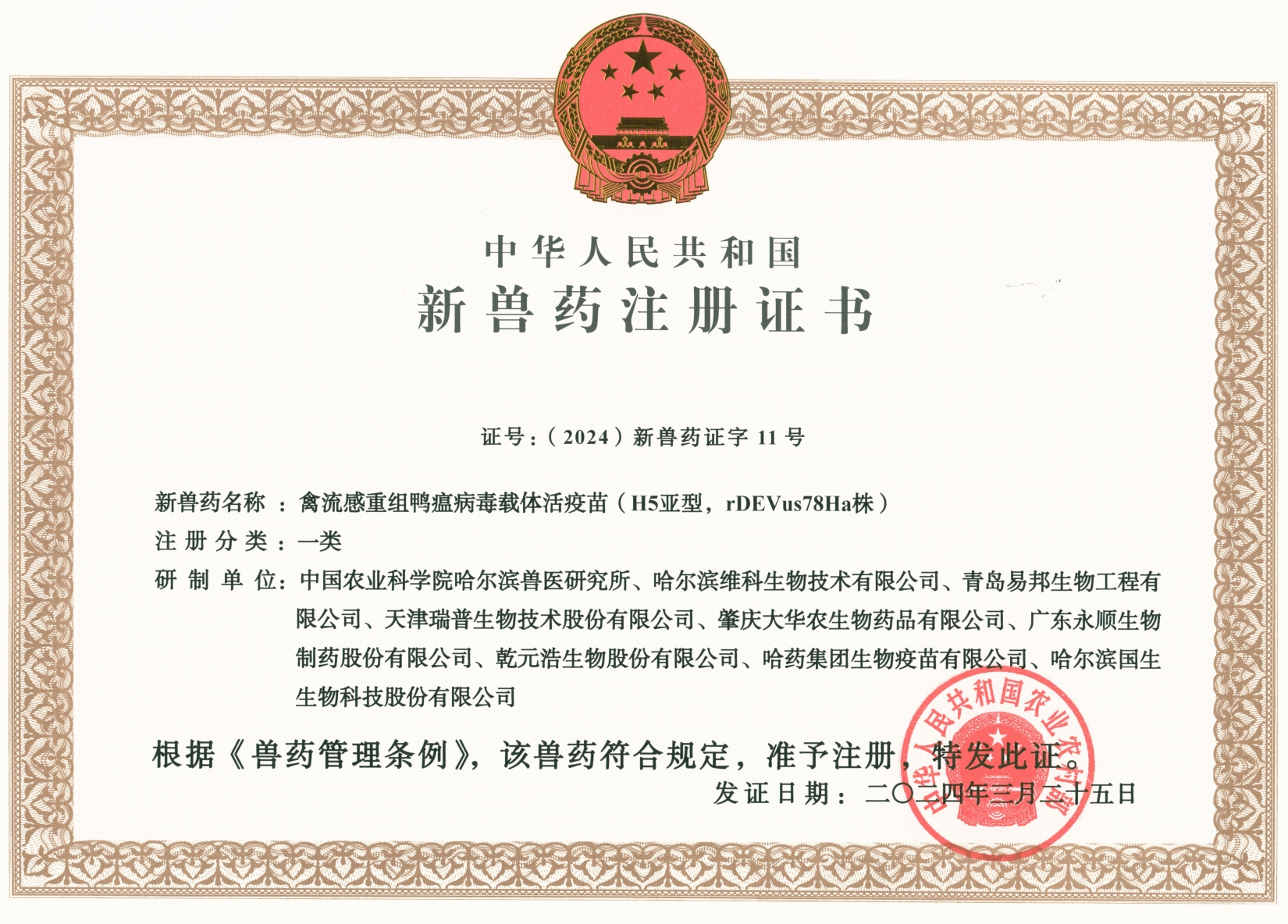 禽流感重组鸭瘟病毒载体活疫苗一类新兽药证书