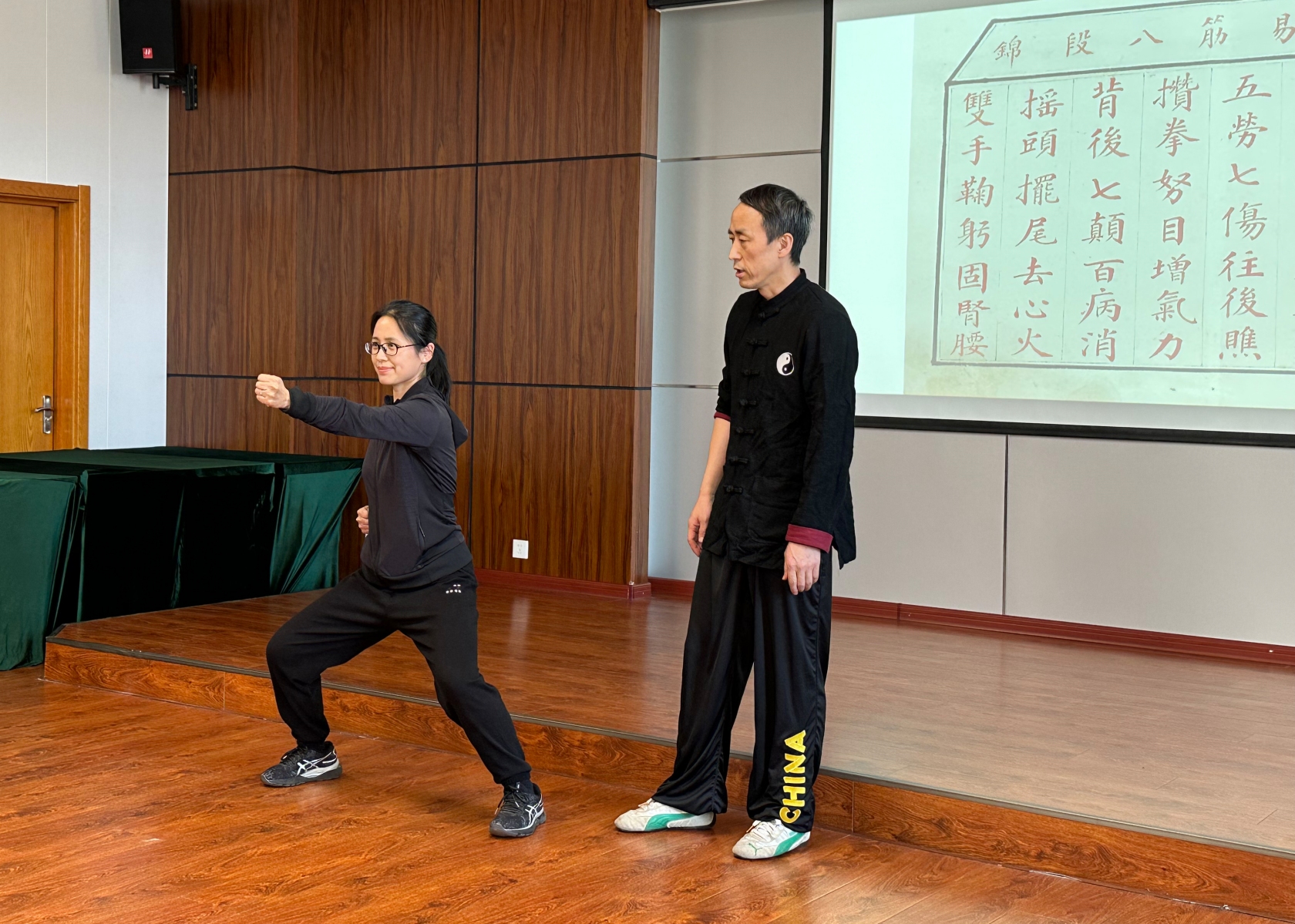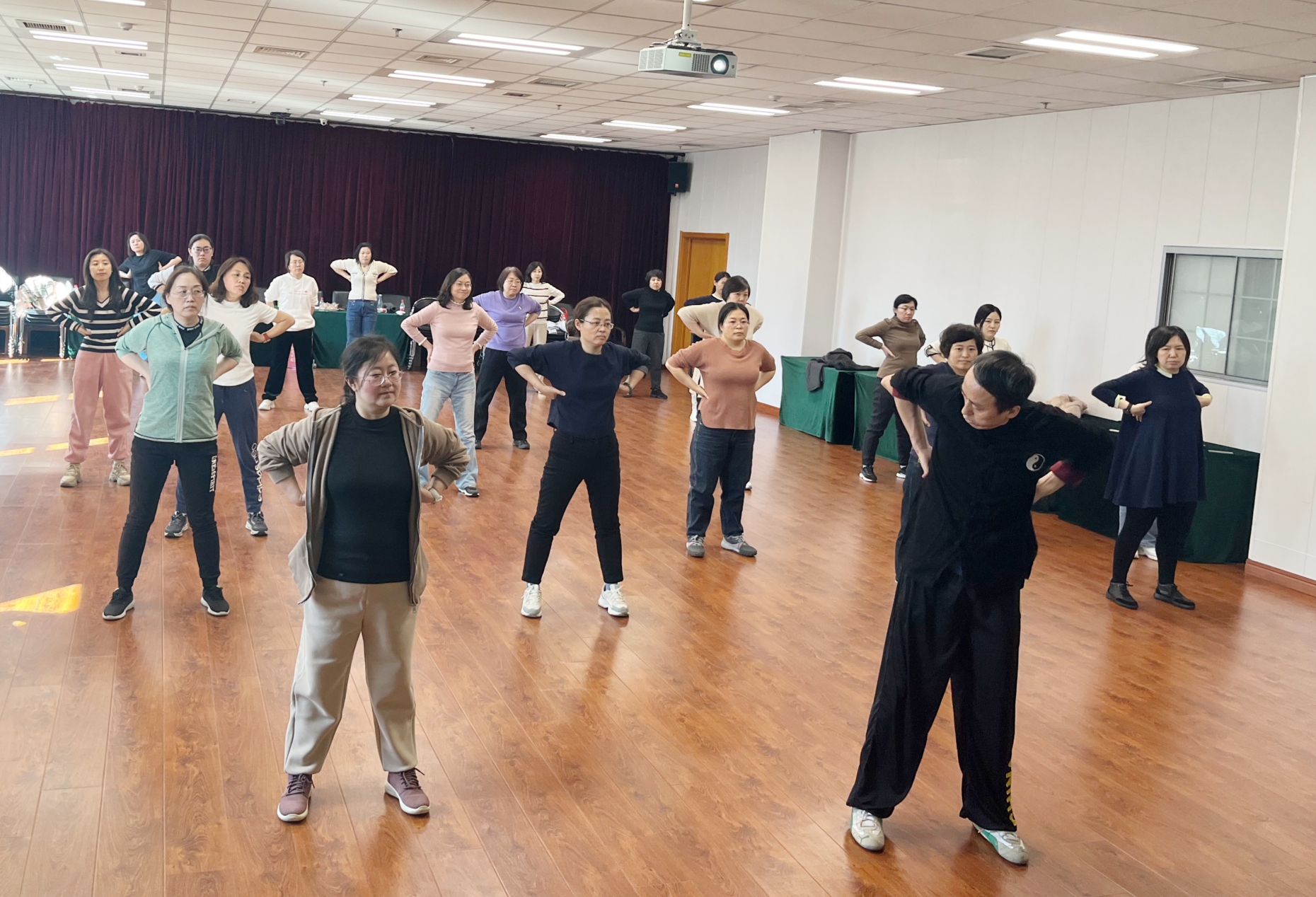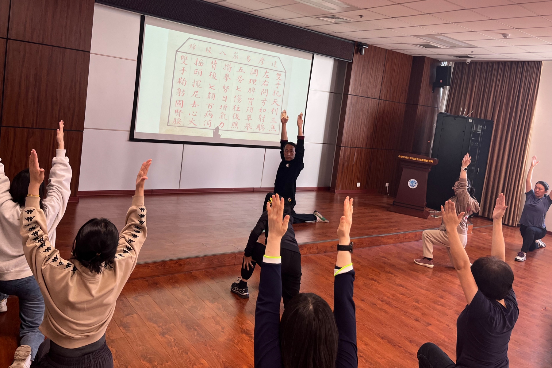 在近3个小时的教学中,李老师将看似简单的《八段锦》拆解开来,用通俗易懂的语言讲解了八段锦的全套动作和口诀。从一招一式到呼吸吐纳,从台上到台下,把这一段12分钟的基础气功系统植入到每个在场学员的脑海中。通过“动作分解+练习”,女职工们放松心情,全身心的投入到学习中。课程最后,李老师还介绍了一些养生锻炼的小窍门,并与在健身中有困惑的同事们交流了心得,一节课下来大家受益匪浅。
