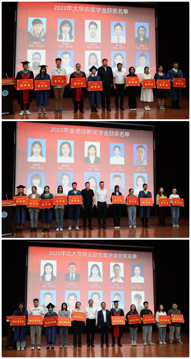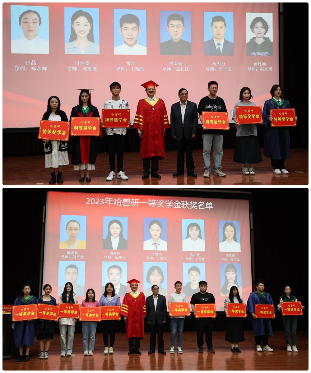 在研究所和合作企业的支持帮助下,毕业典礼上颁发了“哈兽研”、“大华农”、“金诺诊断”、“北大荒牧业”4项奖助学金,共有77名同学获奖,发放奖助学金62万元。