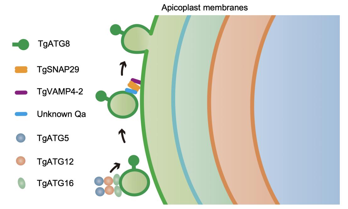 该研究发现了ATG12–ATG5-ATG16L复合物存在于弓形虫中,具有促进TgATG8的脂化活性。TgATG8定位于顶质体的过程依赖于TgSNAP29/TgVAMP4-2 SNARE复合物介导的囊泡融合。TgATG8保守的UDS位点对于其在顶质体上正确定位也至关重要。这些研究结果说明,弓形虫的自噬系统极可能参与了顶质体的靶向转运过程。另一方面,弓形虫自噬相关蛋白对于虫体持续感染也至关重要。因此,本研究也对弓形虫弱毒疫苗的研发具有指导意义。