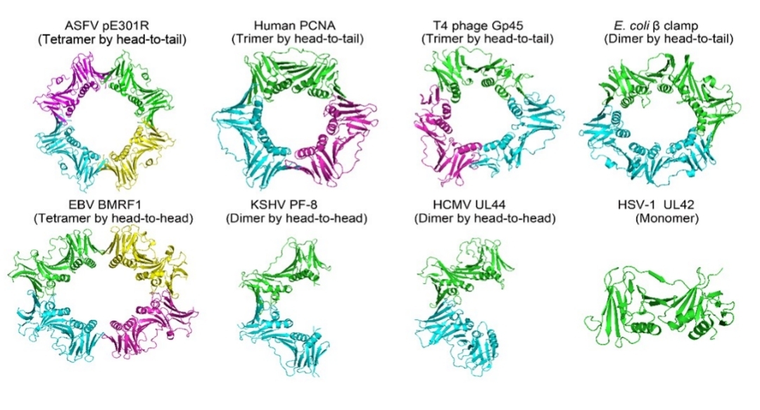 本研究鉴定了pE301R作为ASFV的DNA复制机器的重要组分,明确了pE301R在病毒基因组复制过程中的具体作用,为研发新型抗病毒策略提供了候选靶标。本研究发现了一种病毒编码的新型滑动夹样结构,丰富了对不同物种DNA复制过程中功能的认知。