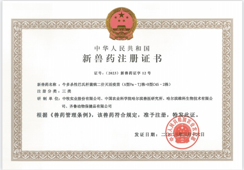 近日,由中国农业科学院哈尔滨兽医研究所(以下简称“哈兽研”)、中牧实业股份有限公司(以下简称“中牧股份”)、哈尔滨维科生物技术有限公司、齐鲁动物保健品有限公司共同研制的牛多杀性巴氏杆菌病二价灭活疫苗(A型Pm-TJ株+B型C45-2株)经农业农村部批准,喜获三类新兽药证书。该疫苗主要用于预防牛荚膜A型多杀性巴氏杆菌引起的牛纤维素性化脓性肺炎和牛荚膜B型多杀性巴氏杆菌引起的牛出血性败血症。