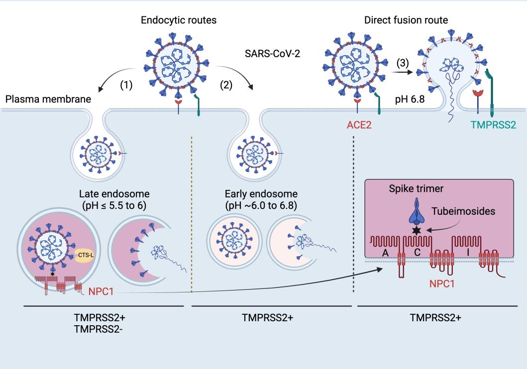 迄今已有抗冠状病毒和丝状病毒的药物推向应用,但主要靶向周期的中后期功能分子,如转录或翻译后加工。本研究结果揭示NPC1作为膜融合受体介导新冠病毒和埃博拉病毒入侵细胞的新机制,发现土贝母苷为NPC1特异靶向分子,有效抑制新冠病毒和泛丝状病毒复制,表明土贝母苷具有靶向新冠病毒和泛丝状病毒复制早期阶段抗病毒药物的开发潜力。