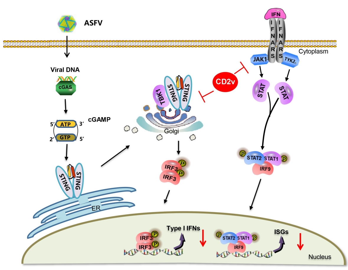 通过荧光定量PCR和酶联免疫吸附试验发现,与亲本病毒ASFV HLJ/18相比,EP402R基因敲除的毒株感染猪肺泡巨噬细胞产生更多的I型干扰素。进一步研究发现,EP402R基因编码的蛋白CD2v通过与IFN基因刺激因子(STING)的跨膜结构域相互作用,阻止了STING向高尔基体的运输,从而抑制I型干扰素的产生。同时,ASFV CD2v通过破坏干扰素受体与酪氨酸激酶2和JANUS激酶1的相互作用,从而抑制了IFN-α诱导的抗病毒基因的表达。动物实验结果表明,与ASFV HLJ/18株相比,EP402R基因缺失病毒ASFV-ΔEP402R感染无特定病原体(SPF)猪诱导产生更多的I型干扰素,ASFV-ΔEP402R对SPF猪的致病力显著减弱。该研究揭示了ASFV CD2v通过抑制Ⅰ型干扰素产生和干扰素信号通路影响ASFV致病力的分子机制,为阐明ASFV弱毒株的致弱机制提供参考。