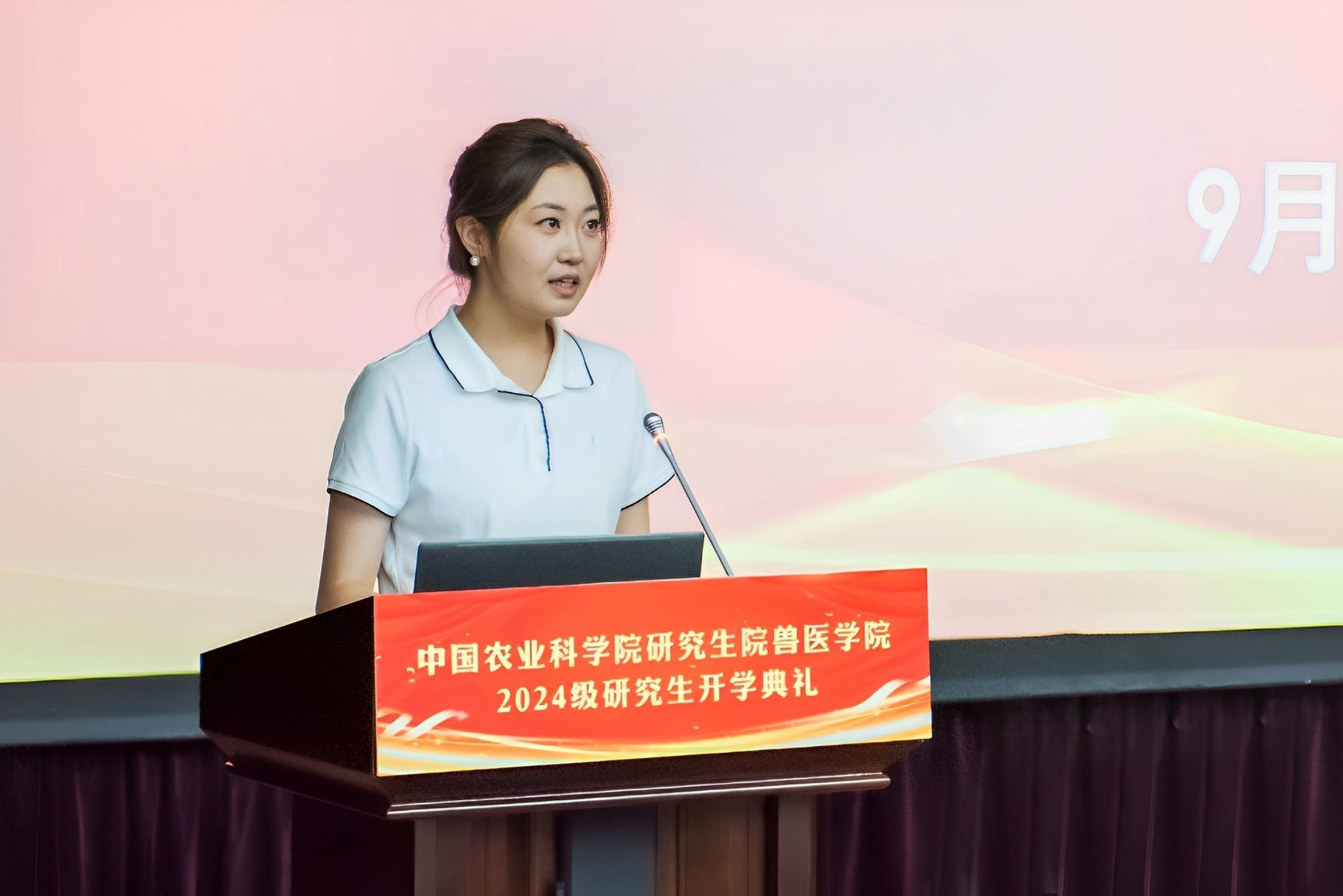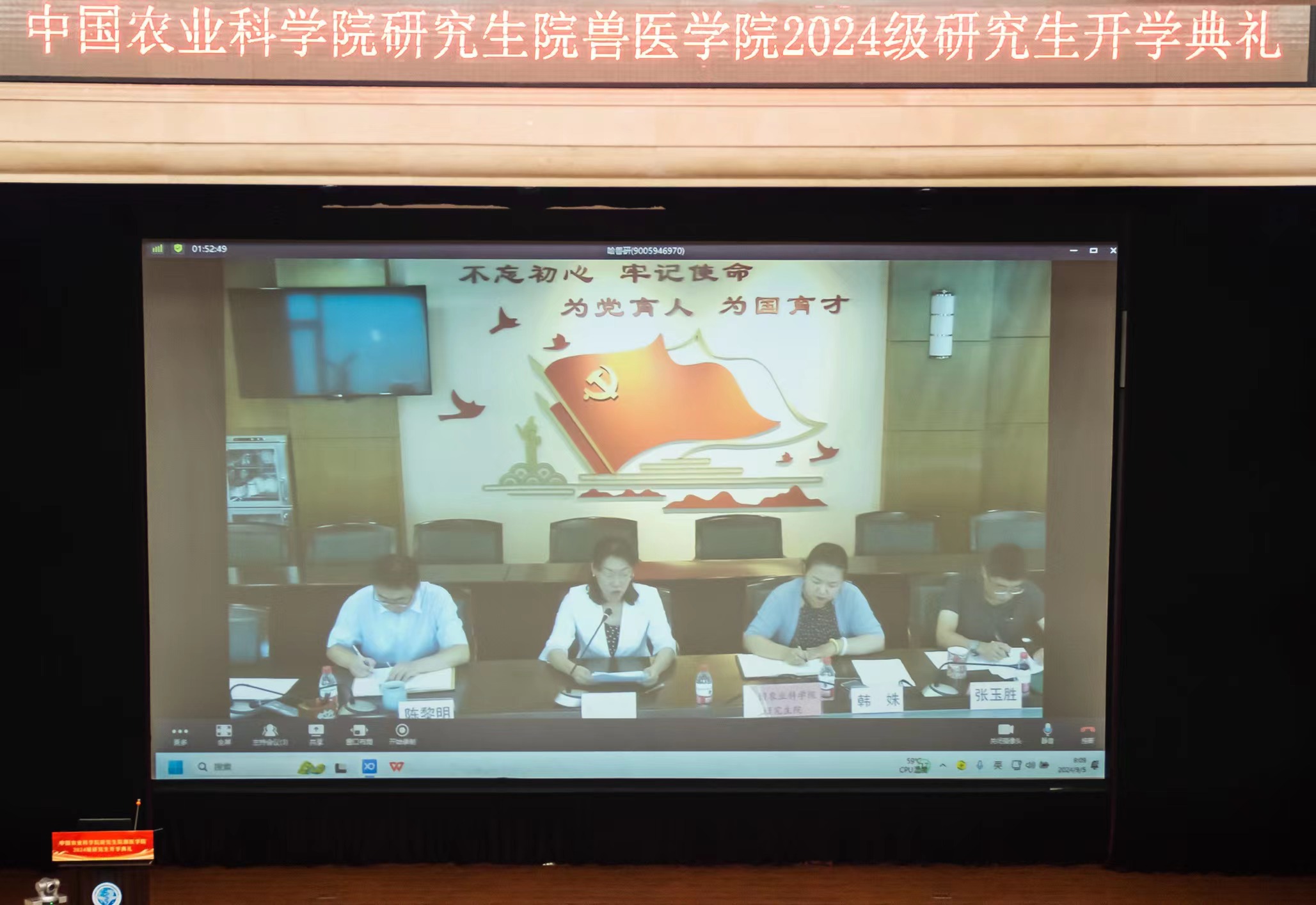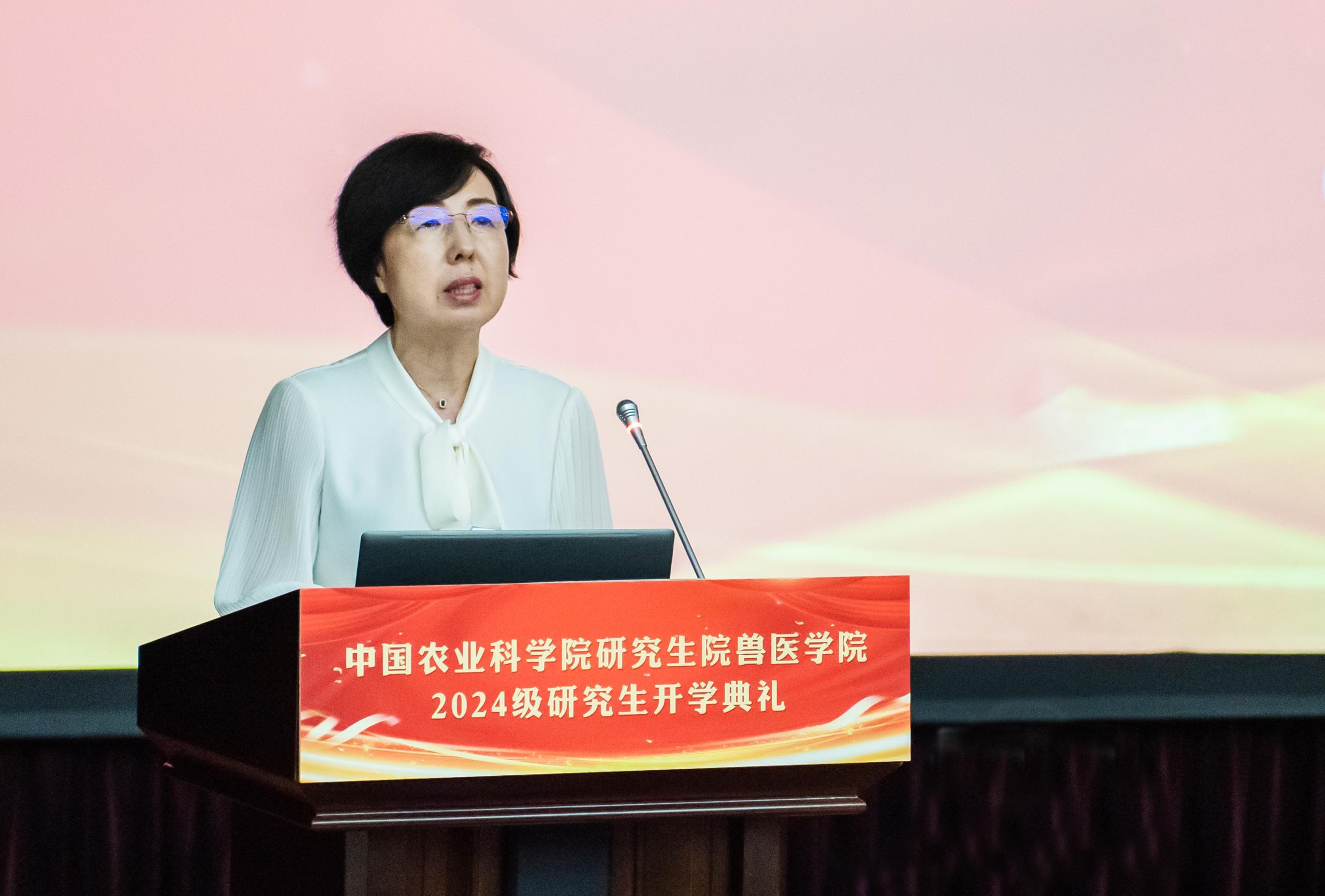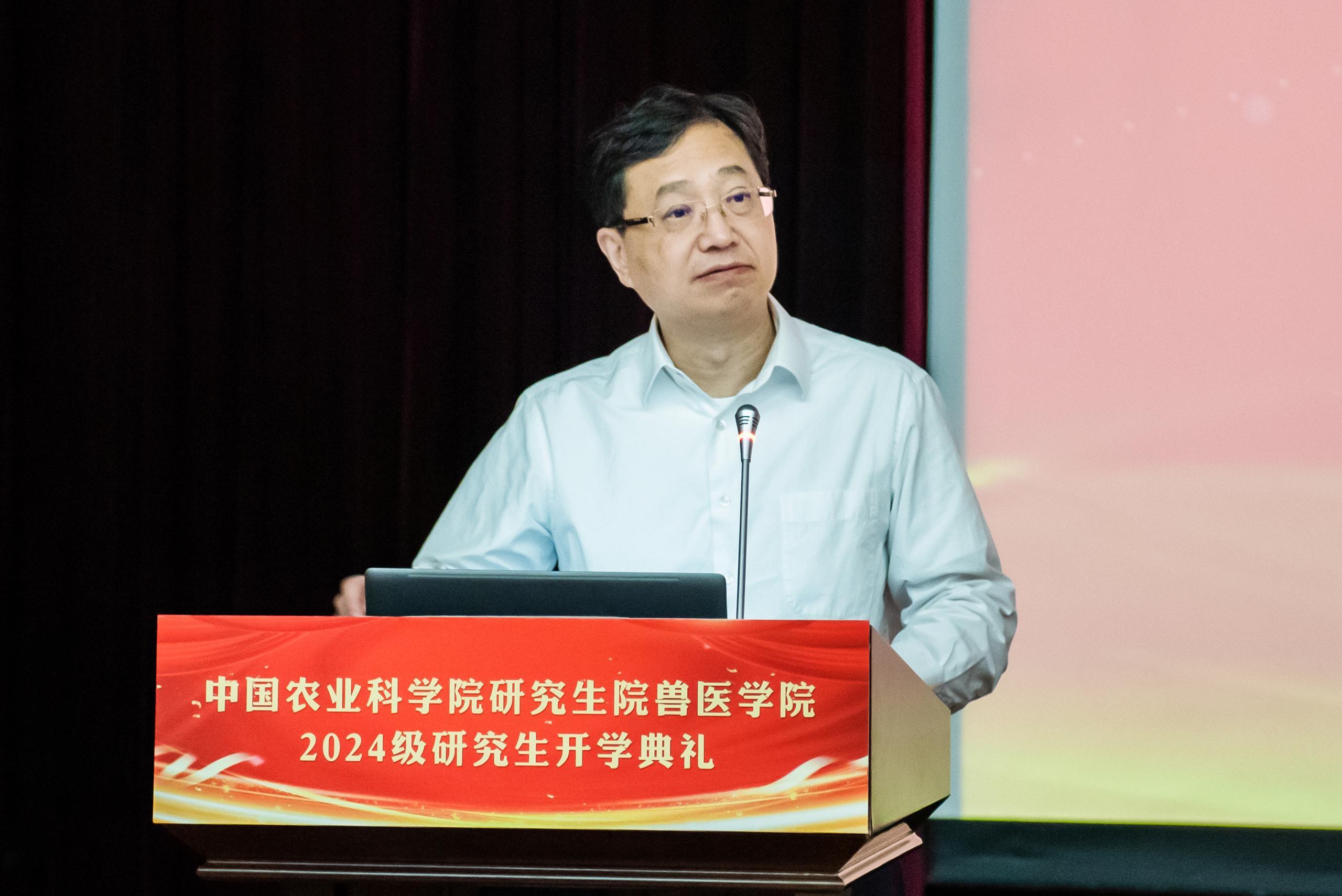 9月5日,中国农业科学院研究生院兽医学院以线上线下结合方式举办2024级研究生开学典礼,隆重欢迎299名新同学。研究生院党委书记姜梅林、党委办公室主任韩姝、院办公室主任陈黎明、招生就业处处长张玉胜线上出席,兽医学院院长、哈尔滨兽医研究所所长步志高,兰州畜牧与兽药研究所副所长李建喜,饲料研究所副所长李秀波,特产研究所副所长张建峰,哈尔滨兽医研究所副所长孙百明、副所长王晓钧、副所长李呈军、纪委书记周亮和党办主任张晓鹏,特产所科研处处长张铁涛,兰州兽医研究所科研处副处长白兴文,上海兽医研究所研究员顾惠明和中国兽医药品监察所副研究员王彬等在现场参会。开学典礼由兽医学院常务副院长刘益民主持。