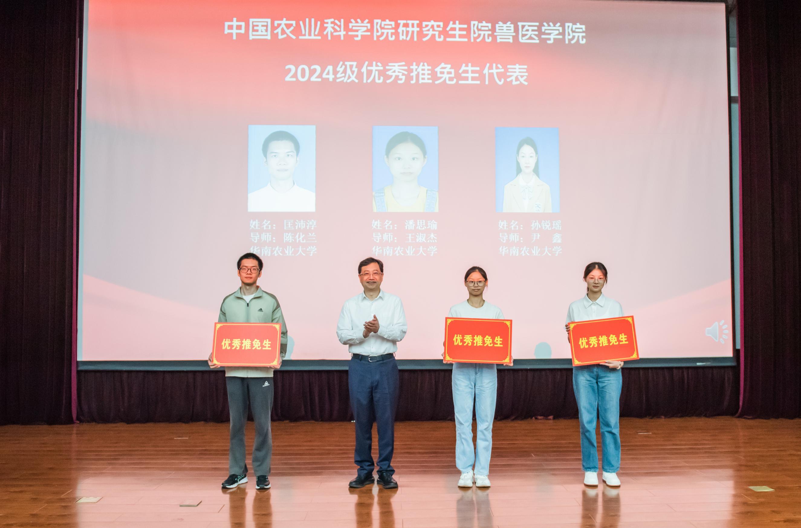开学典礼上,兽医学院对匡沛淳、潘思瑜和孙锐瑶3名优秀推免生代表进行了表彰。