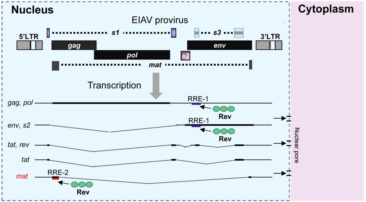 慢病毒的转录发生在细胞核,转录后产生的各种转录本利用2种途径从细胞核转运到细胞质,随后完成基因的表达。通常,完全剪接转录本利用细胞mRNA转运的经典途径核输出(NXF1/NXT1途径);而全长基因组或未完全剪接转录本通过其转录调节元件RRE与病毒调节蛋白Rev结合,利用CRM1途径核输出。早期研究认为EIAV仅存在一个RRE,其位于Env编码区。本研究发现,Mat的表达依赖于Rev的核输出活性和CRM1核输出途径;Rev可以特异性地结合mat第一外显子促进mat mRNA核输出,即mat第一外显子可作为转录后调控元件介导Mat的表达。这表明,除了位于Env编码区的RRE(RRE-1)外,EIAV在Mat第一外显子还存在一个新的RRE(RRE-2)。此外,Rev-RRE-1和Rev-RRE-2在发挥核输出功能时依赖于Rev蛋白的不同功能域,而且RRE-2不能替代RRE-1介导病毒结构蛋白Gag-Pol的表达,这提示Rev介导病毒RNA的核输出分子机制是复杂多样的。