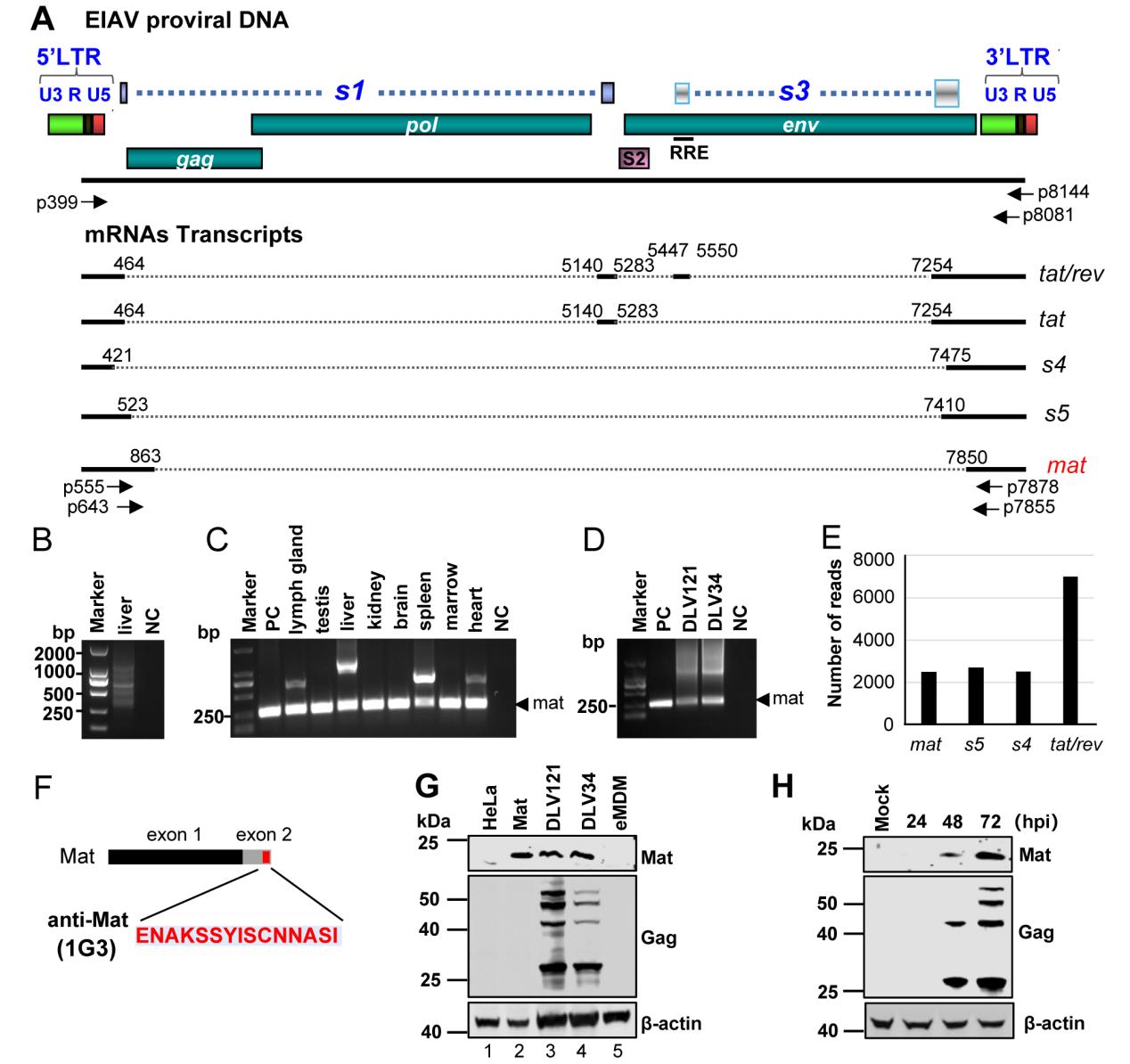 马传染性贫血病毒(EIAV)与人免疫缺陷病毒(HIV-1)同属于逆转录病毒科慢病毒属的成员。慢病毒是一类基因组结构较为复杂的反转录病毒,其基因组除了编码反转录病毒共有的3个结构蛋白(Gag、Pol和Env)外,还编码3-6个不等的附属蛋白。前期研究认为,EIAV是基因组结构最简单的慢病毒,只编码3种附属蛋白(Tat、S2和Rev),而HIV-1编码6种附属蛋白(Tat、Rev、Nef、Vpu、Vif、Vpr)。该研究从EIAV感染马的组织中扩增到多种新的mRNA转录本,并证明了其中一种单剪接转录本可以编码新的病毒蛋白Mat。