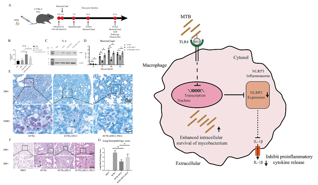 宿主被MTB感染后,宿主先天免疫系统的NLRP3炎症小体在抵抗MTB感染中发挥重要作用。NLRP3的表达是NLRP3炎症小体活化的关键标志物,而MTB通过抑制NLRP3炎症小体的活化进而逃逸宿主先天免疫反应,但其机制不清。本研究发现定位于MTB胞外的PE12蛋白能够与巨噬细胞的TLR4受体相互作用,形成PE12-TLR4复合物,参与抑制NLRP3的转录与表达,进而减少IL-1β的转录与释放,协助MTB逃逸巨噬细胞的杀伤,促进MTB在宿主体内的定殖,并加剧MTB诱导小鼠脏器的病理损伤,在MTB逃逸宿主先天免疫反应的过程中发挥重要作用。