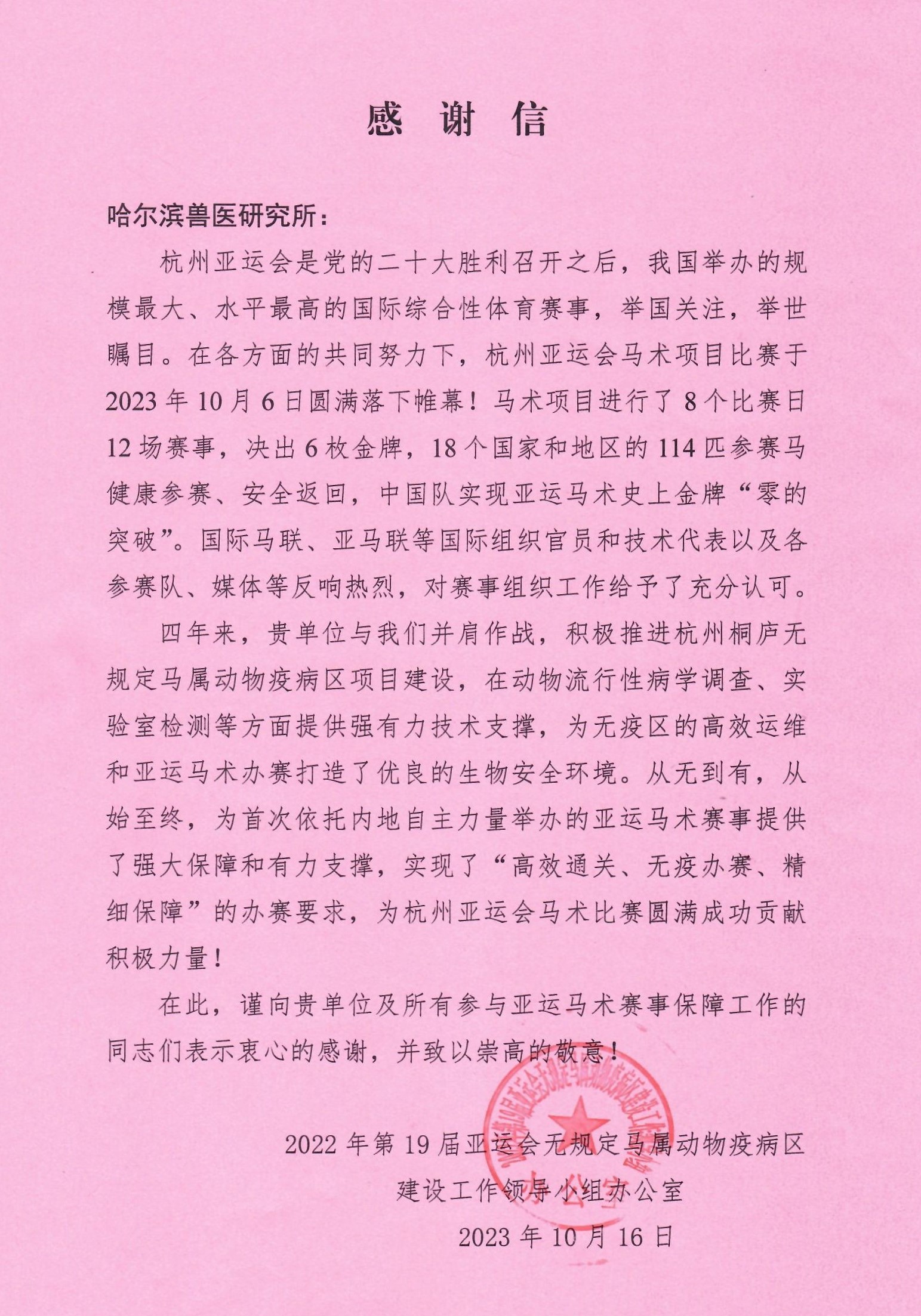 2023年10月16日,2022年第19届亚运会无规定马属动物疫病区建设工作领导小组办公室向中国农业科学院哈尔滨兽医研究所(哈兽研)发来感谢信,感谢哈兽研“积极推进杭州桐庐无规定马属动物疫病区建设,在动物流行病学调查、实验室检测等方面提供强有力技术支撑,为无疫区的高效运维和亚运马术比赛打造了优良的生物安全环境”。