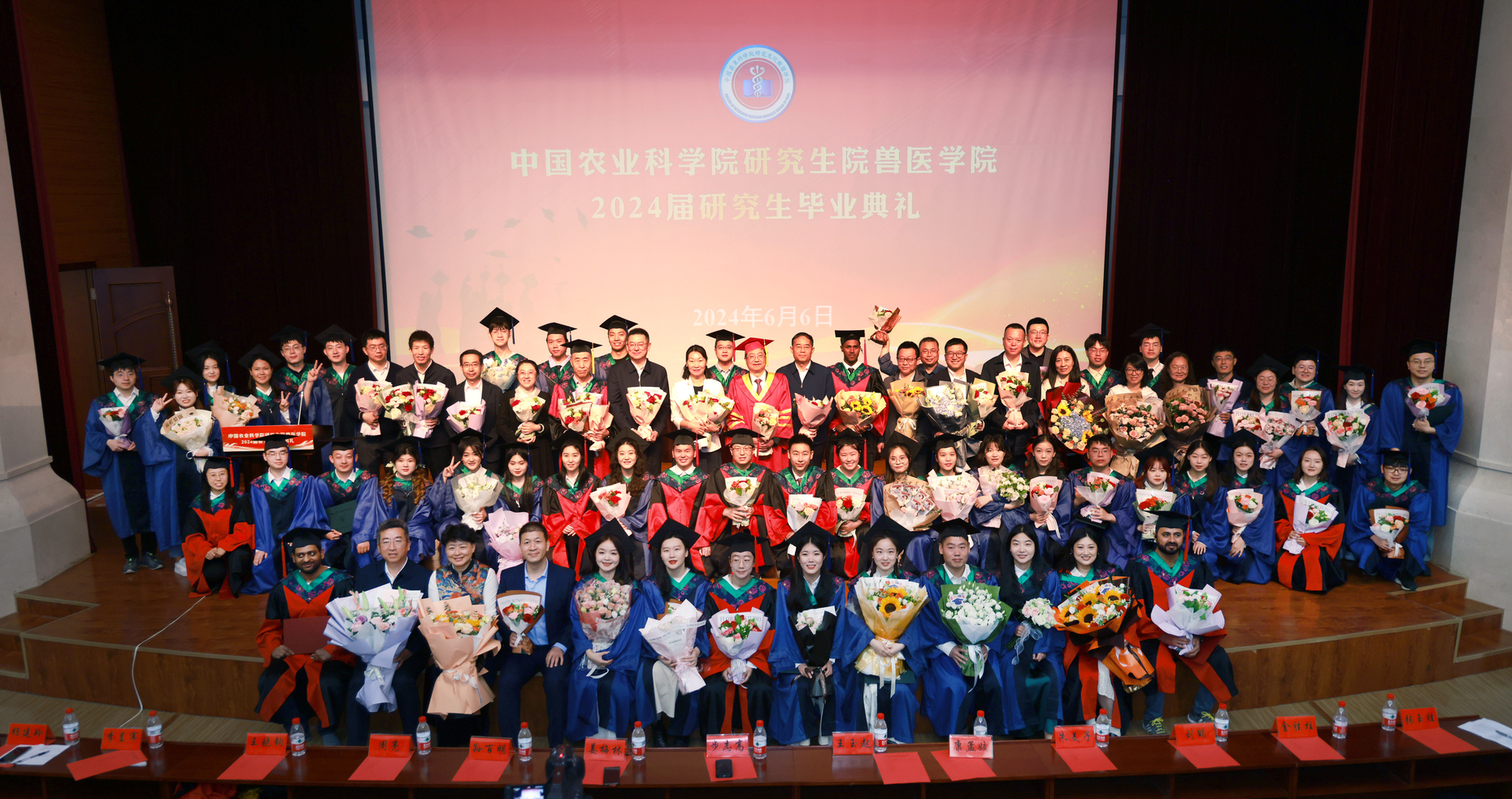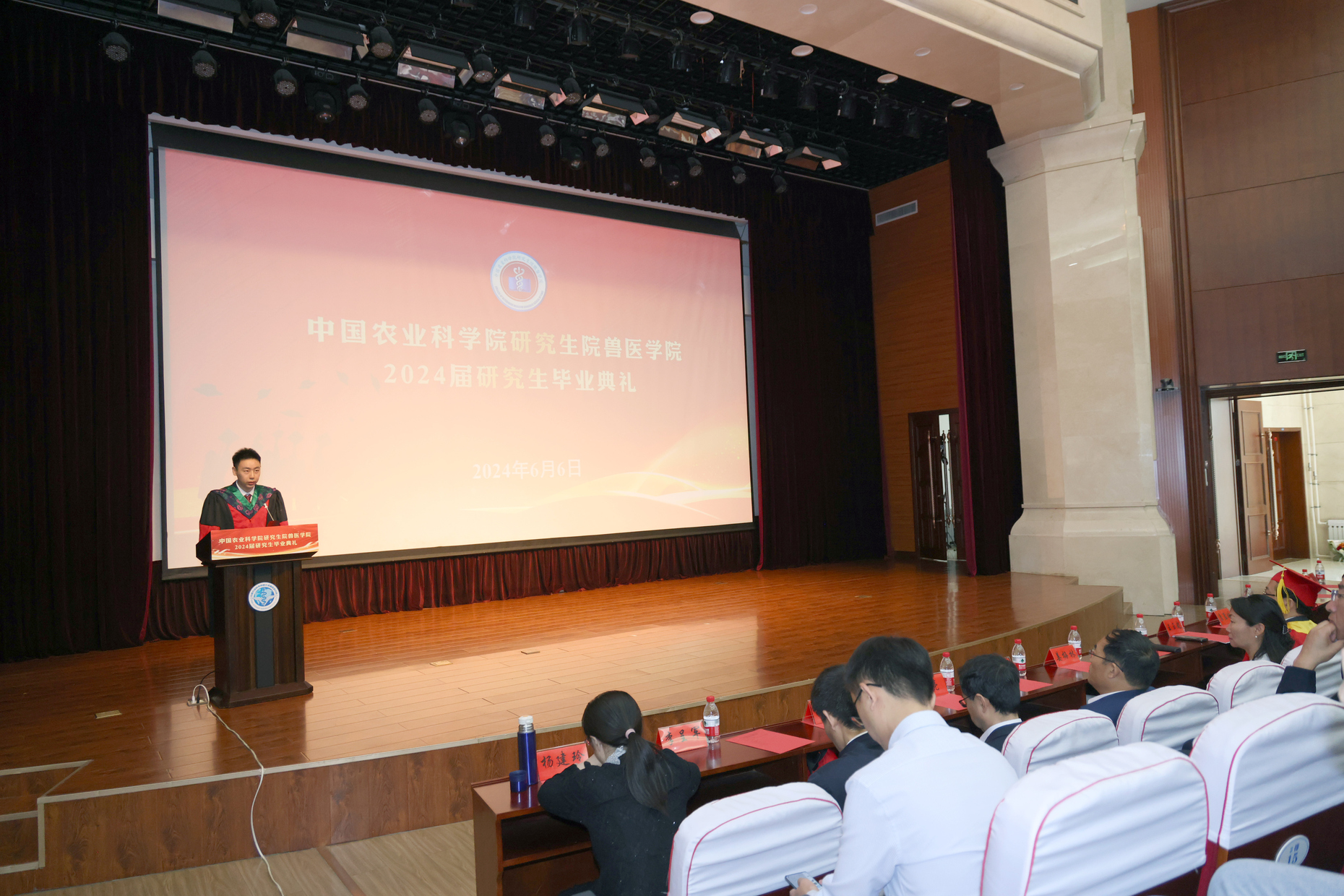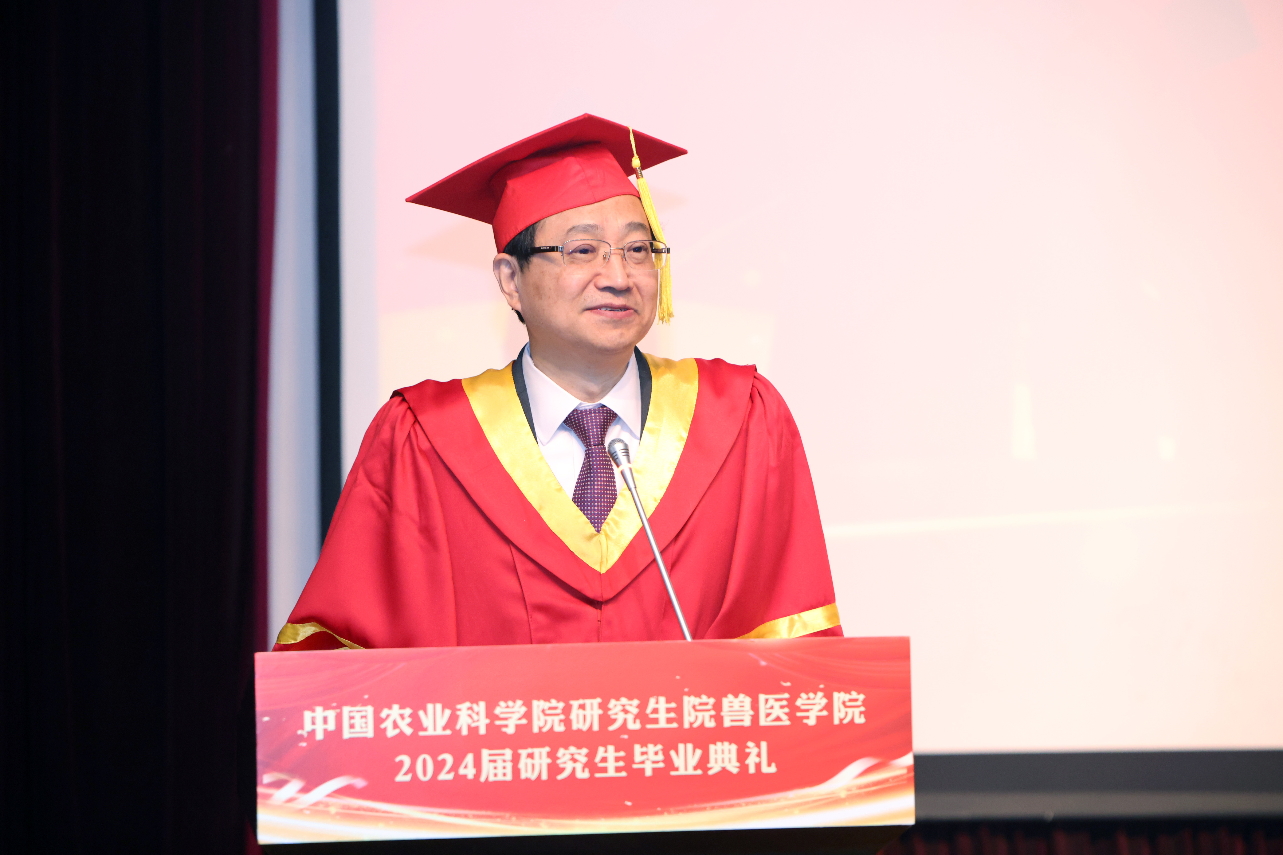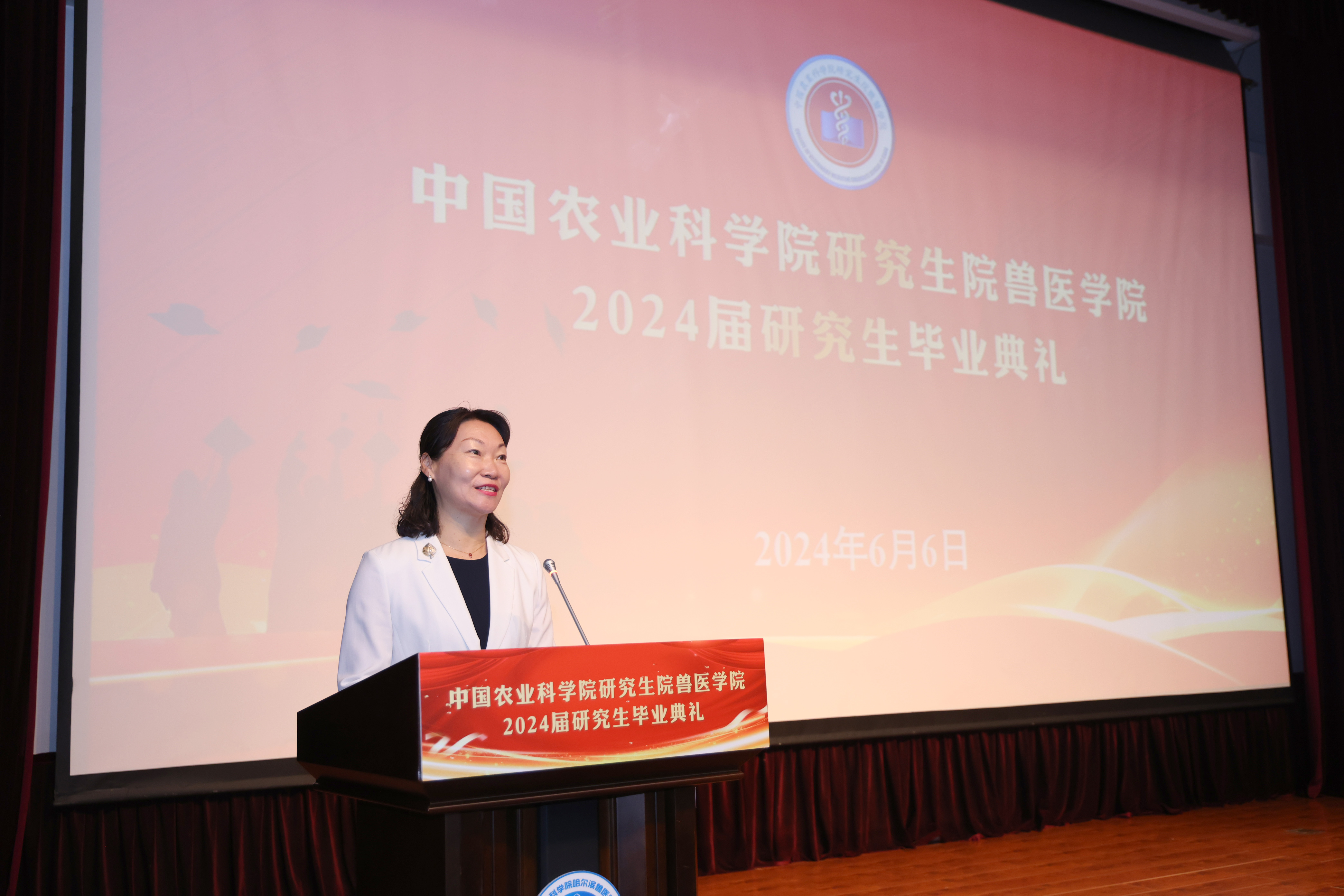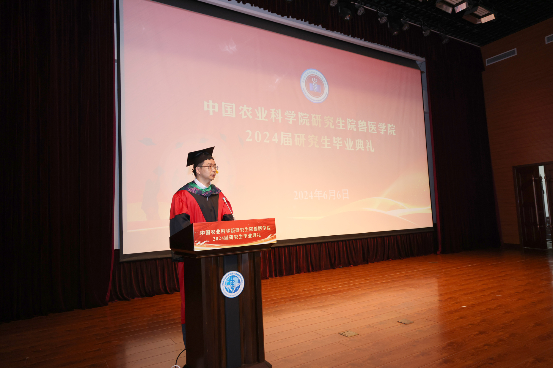 6月6日,中国农业科学院研究生院兽医学院2024届研究生毕业典礼在哈尔滨兽医研究所综合楼1058报告厅举行。研究生院书记姜梅林,兽医学院院长、哈兽研所长步志高,副所长孙百明,纪委书记周亮,副所长王晓钧,副所长李呈军,党委委员、党办主任张晓鹏,黑龙江北大荒牧业集团有限公司董事长王玉起、副总经理金胜柱,广东温氏大华农生物科技有限公司副总裁康孟佼,北京金诺百泰生物技术公司经理刘鹤,哈尔滨东方基因生物制品有限公司总经理朱美子以及研究所职能部门负责人和创新团队首席、班主任、导师、研究生300余人参加。毕业典礼由兽医学院常务副院长刘益民主持。