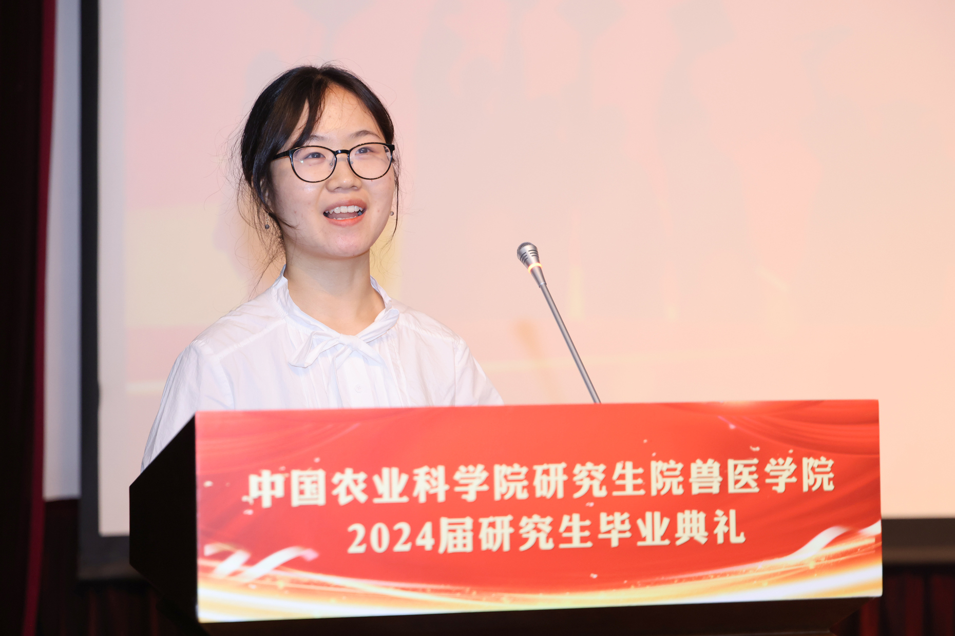 牛羊传染病创新团队首席科学家尹鑫研究员代表导师向毕业生表示衷心的祝贺,希望各位毕业生多运动,锻炼好身体;拒绝内耗,拥抱内卷,少空想,多实干!动物流感基础与防控研究创新团队2020级博士倪子欣代表毕业生发言,他回忆了在哈兽研和兽医学院的美好时光以及在实验室科研工作中的经历,向并肩作战的导师、全院各级领导、同窗好友表示最诚挚的谢意!2022级硕士张亚丽代表在校生发言,向即将离开兽医学院和哈兽研的师兄师姐表达衷心的祝福,感谢师兄师姐们在科研路上的帮助和支持,愿他们山一程、水一程,身向理想那畔行,风一更,雪一更,阅无限风光在顶峰!