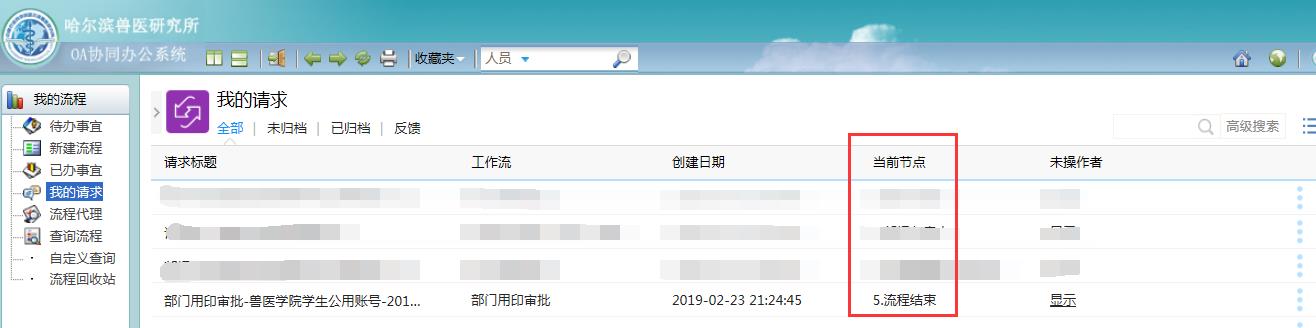 3、查看审批结果,当前节点为“流程结束”即可到研究所办公室(综合楼4089室,不是兽医学院楼)盖章。