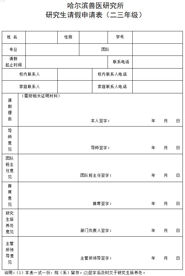 哈尔滨兽医研究所研究生请假申请表(二三年级)如下,
