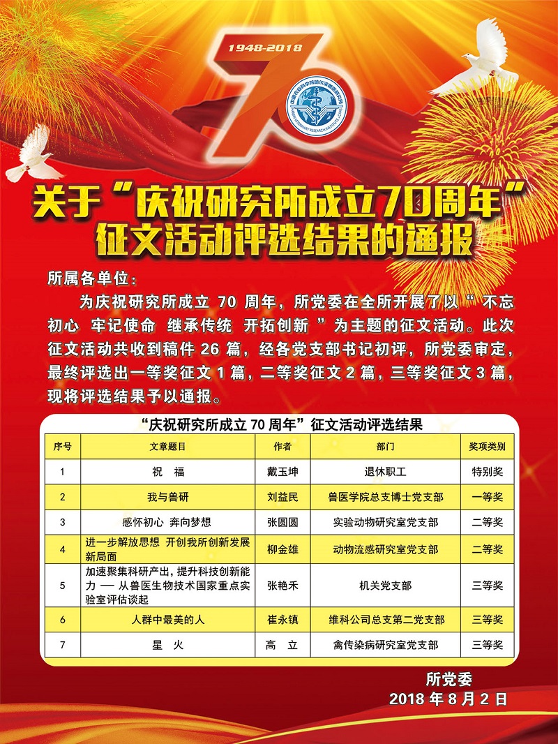 关于“庆祝研究所成立70周年”征文活动评选结果的通报