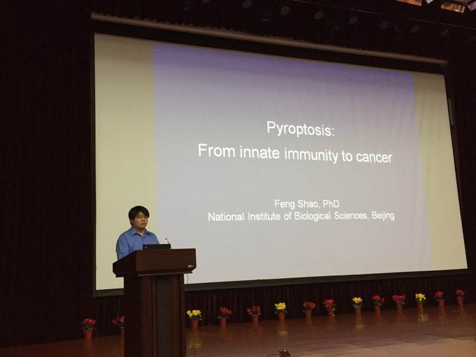 在近100分钟的演讲中,邵峰院士从细菌感染宿主细胞后如何被天然免疫系统感知入手,介绍了细胞内三种受体识别和结合细菌脂多糖LPS后激活Caspase-1的过程,重点阐述了如何鉴定细胞焦亡过程的关键蛋白Gasdermin D以及Caspase-1激活后切割Gasdermin D从而导致细胞焦亡的分子机制,揭示了细胞凋亡和细胞焦亡的区别和联系。此外,邵峰院士还介绍了Gasdermin家族另一成员Gasdermin E在细胞内被Caspase-3切割诱导细胞焦亡的机制及其对癌症治疗的影响和潜在应用。