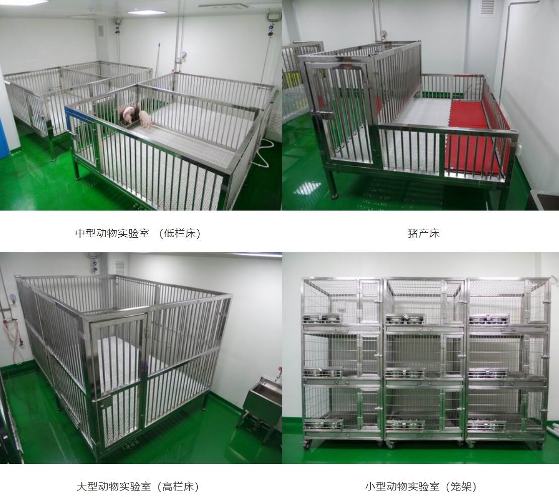 负压屏障环境参数:空气洁净度7级;相临区域最小静压差≥10Pa;全新风通风;换气次数≥15次/小时,大型动物换气次数≥20次/小时。负压屏障环境共设45间独立的实验单元(约30m2/间),内置中型动物实验用低栏床(栏距床面0.9米)、大动物实验用高栏床(栏距床面1.7米)、小型动物实验用笼架、隔离器(初生仔猪)、产床(母猪产房和母仔间)。