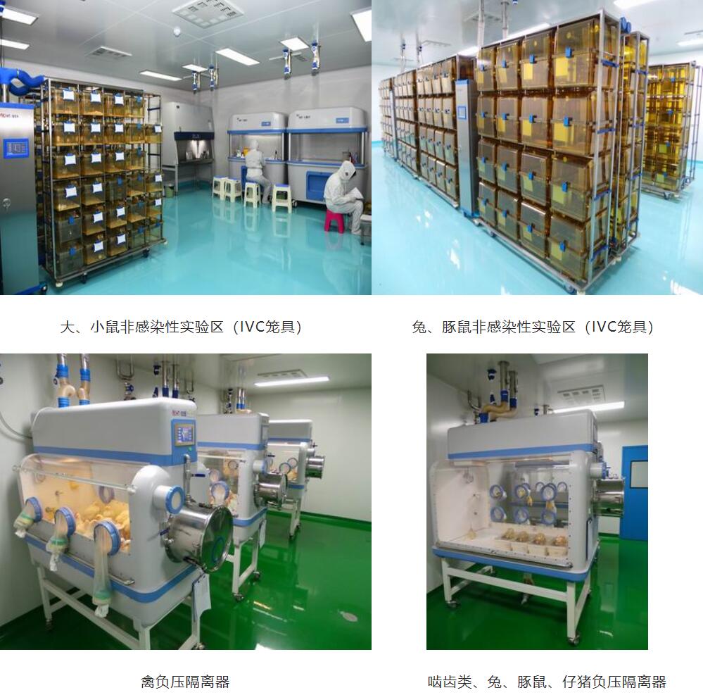 实验区隔离环境由屏障环境下的隔离器和独立通风系统(IVC)组成。目前共有隔离器201台:禽隔离器159台、啮齿类及豚鼠18台、兔12台、仔猪12台;正压IVC系统17套,用于啮齿类、兔、豚鼠非感染性实验,不同品系、不同等级的实验动物分区饲养。